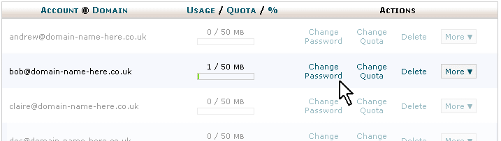 Changing the password of an email accountIt is useful to occasionally change the passwords on your email accounts to maximize your email security. You should always change your password if you think someone else has access to your account. Note: Make sure that you change the password in your offline email application as well, or you will not be able to upload or download email to this account. To change the password of an email account: